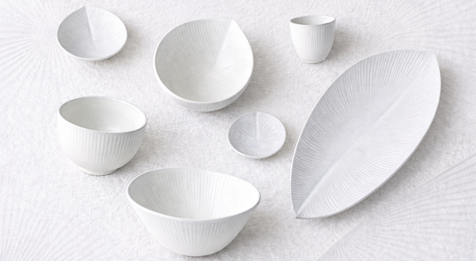 A serene matte-white glaze with delicate ridges reminiscent of wind‑brushed sand meets organic leaf and bowl shapes.