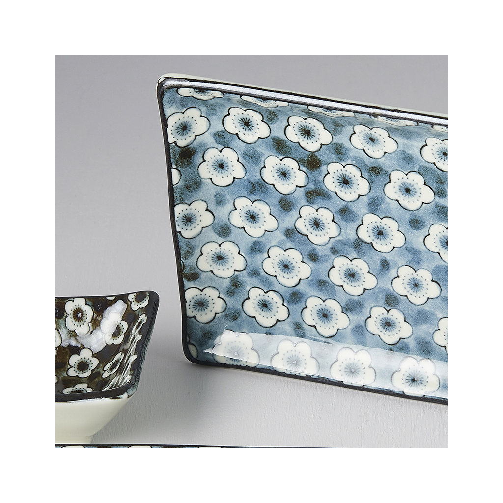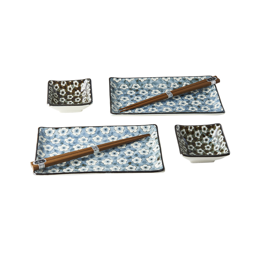 Sada na sushi s designem NAVY & WHITE UME obsahuje 2 x talíř na sushi, 2 x misku na sójovou omáčku a 2 páry jídelních hůlek.