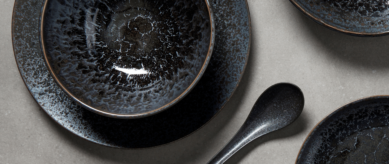 Unverwechselbare Glasur mit schwarzen und blauen Sprenkeln und grauem Metallic-Finish auf der Außenseite. Einige Arten von Tellern und Schalen werden gleichzeitig in zwei verschiedenen, aber ähnlichen Designs hergestellt.