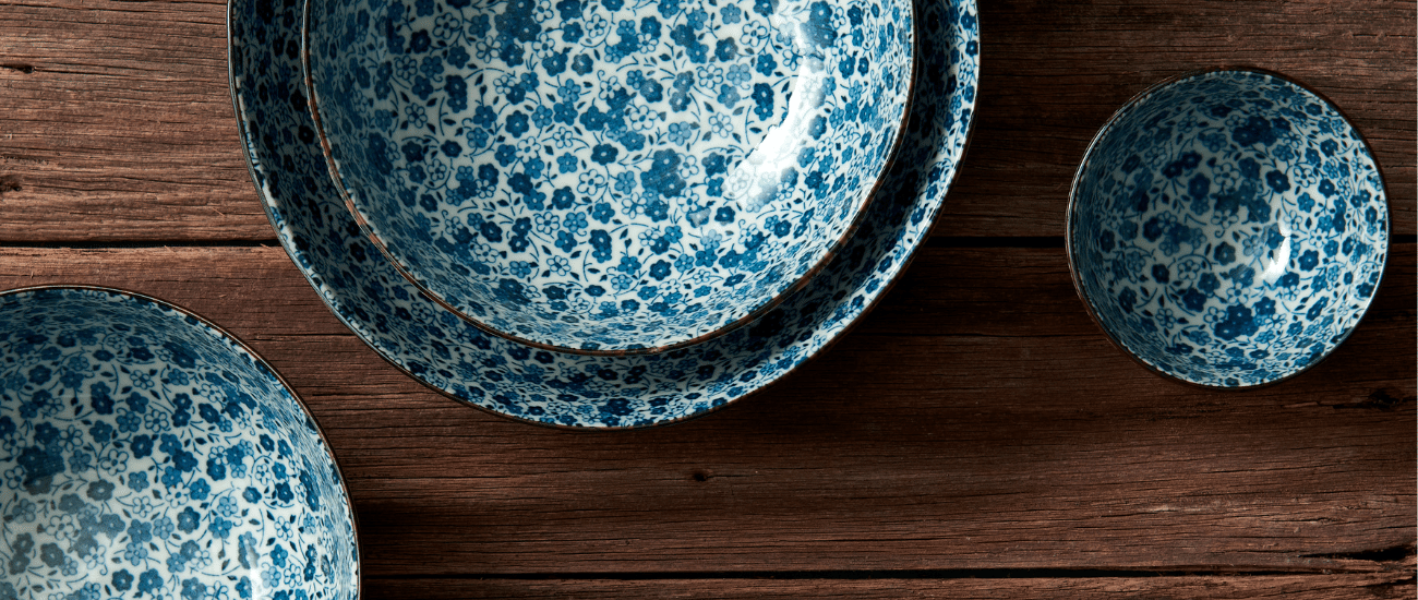 Diese Serie kombiniert klassische und asymmetrische Formen mit einem klassischen blauen Blumenmotiv auf weißem und hellblauem Hintergrund.