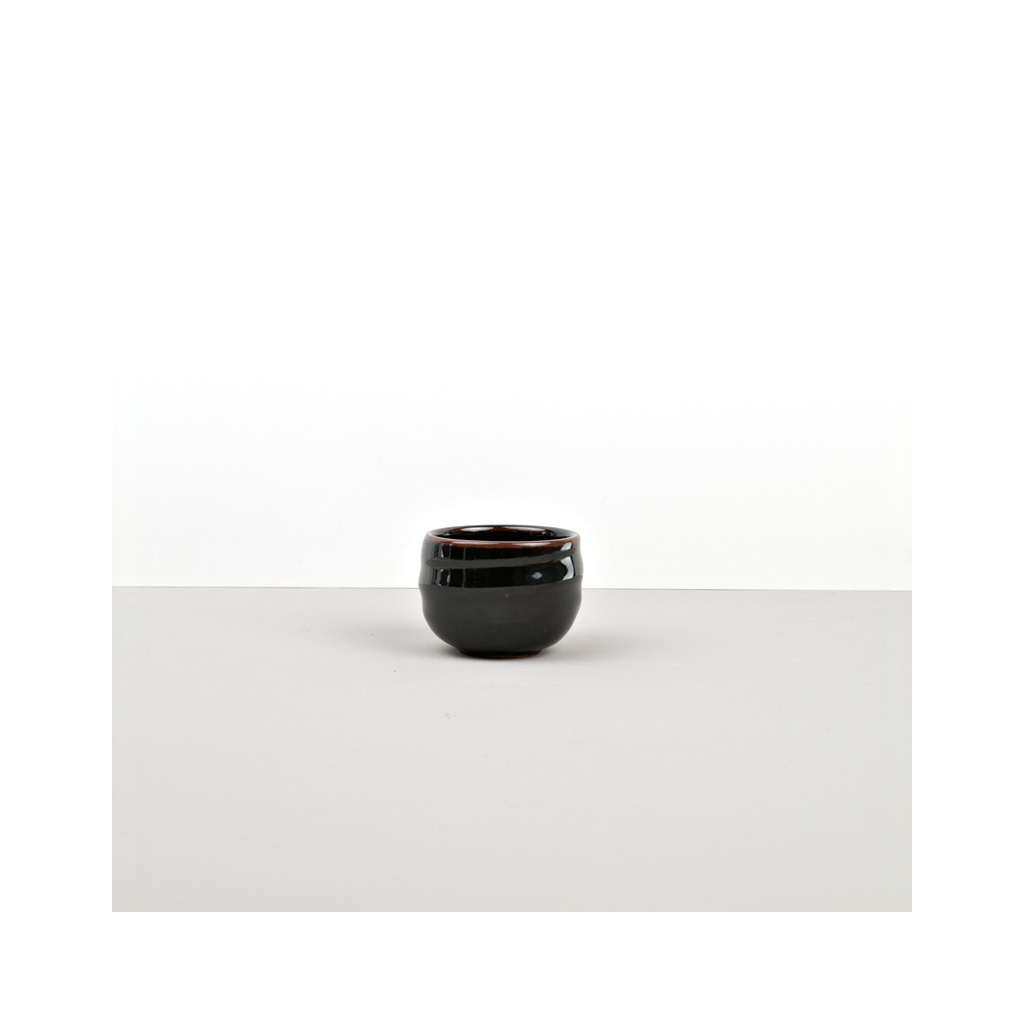 Der Sakebecher hat eine unregelmäßige Oberfläche in schwarzbrauner Farbe. Die Oberfläche ist glatt mit einer glänzenden Glasur.