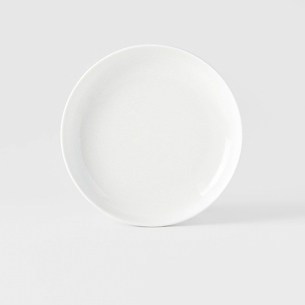 Derweiße flache Teller von Made in Japan ist aus hochwertiger, schadstofffreier Naturkeramik handgefertigt. Jedes Stück ist ein Original. Die Keramiken werden direkt aus Japan importiert. Er ist spülmaschinen- und mikrowellenfest.