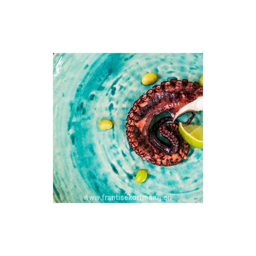 Das Geschirr aus der Kollektion Turquoise zeichnet sich vor allem durch seine satte türkise Farbe aus. Die Sammlung umfasst mehrere Untersammlungen, die sich jeweils leicht unterscheiden. Es gibt sie in matter und glänzender Ausführung, manche haben sogar eine Craquelé-Glasur. Einige Stellen sind verblasst, was den Eindruck erweckt, dass das Geschirr mehrere Jahre lang benutzt wurde. Dieser Teller mit seiner türkisfarbenen, glänzenden Oberfläche erinnert an einen Wasserstrudel oder die Sonne, die auf der Wasseroberfläche glitzert.