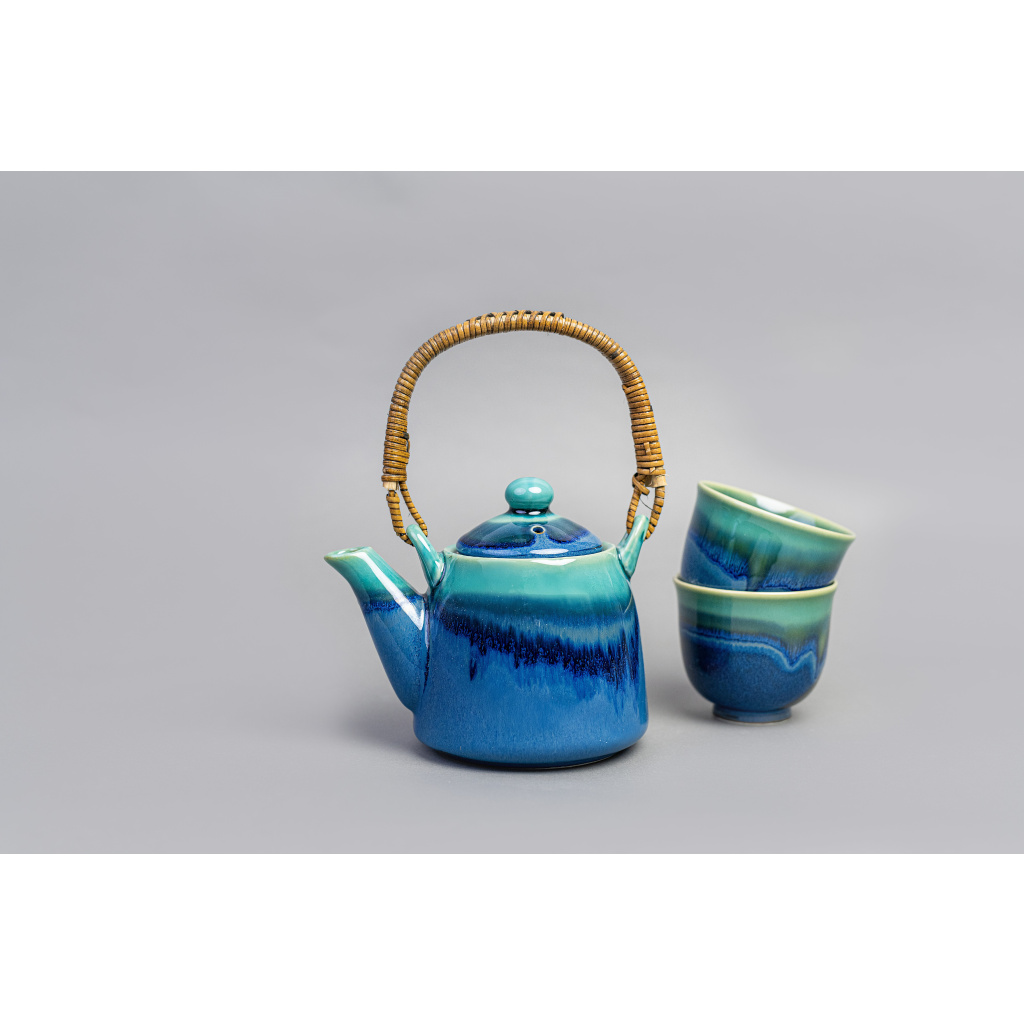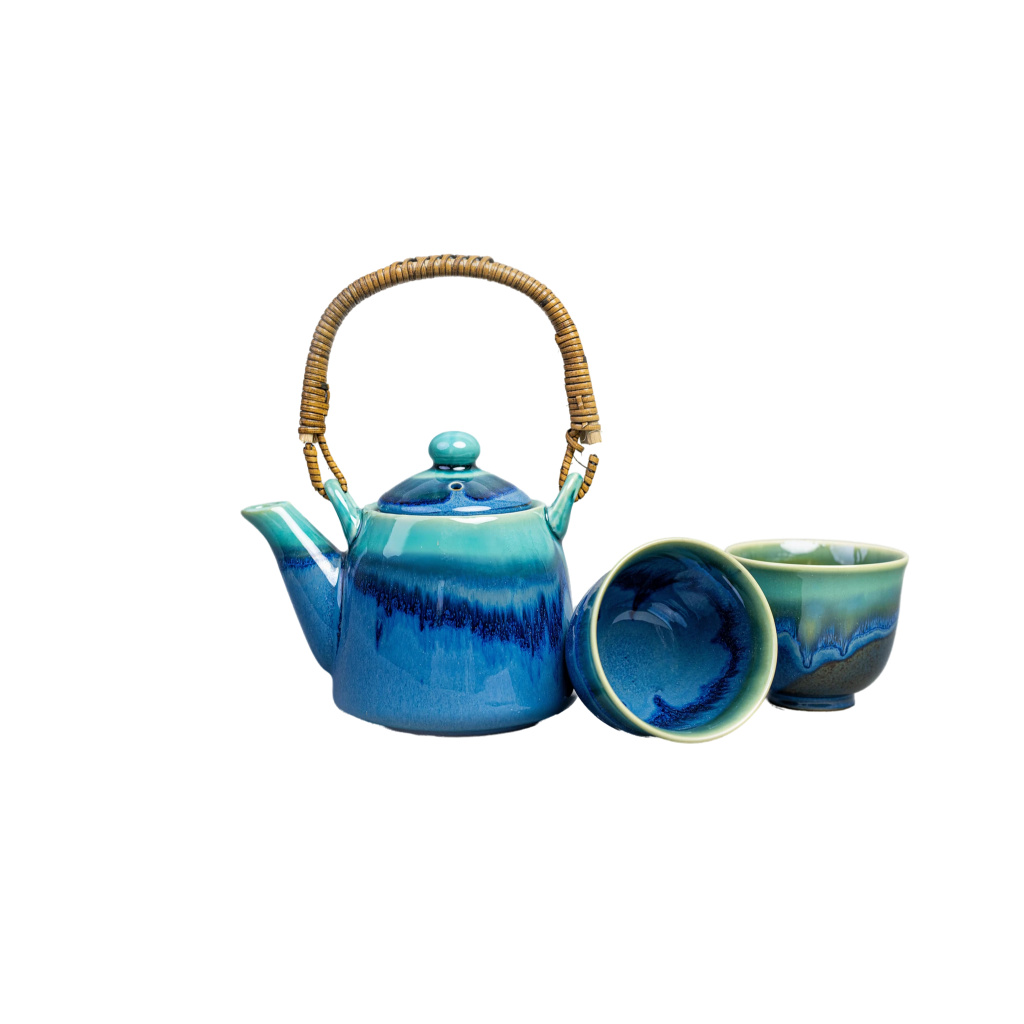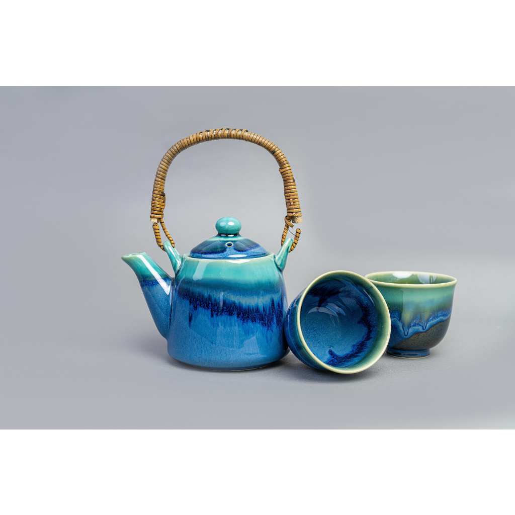 Tea Set Black Cobalt Teal Drip 3 pcs with Strainer