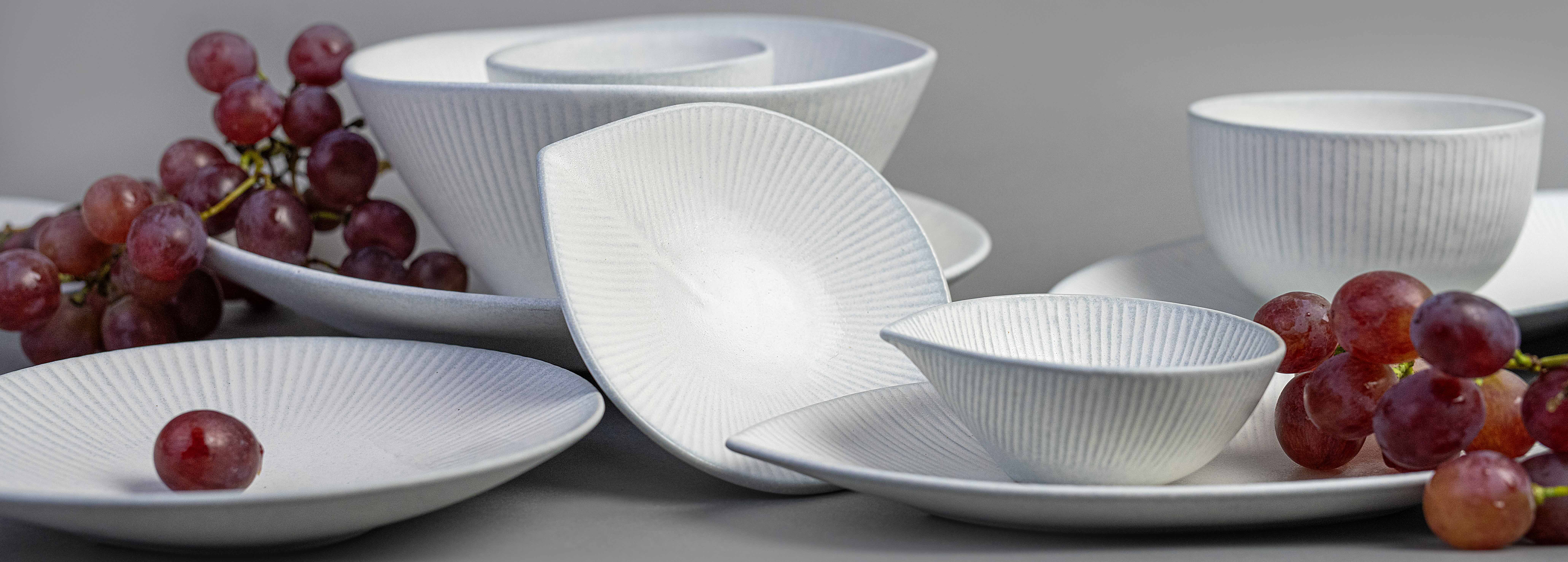 The purity of ceramic and the handcrafted grooves invite touch and play; plates and bowls come in complementary silhouettes that pair effortlessly for a cohesive yet dynamic tablescape.